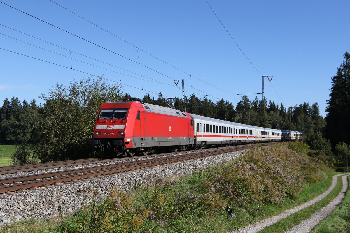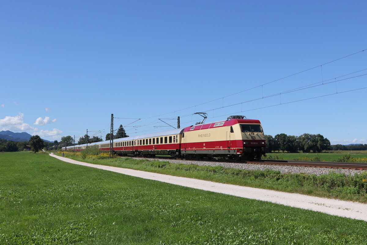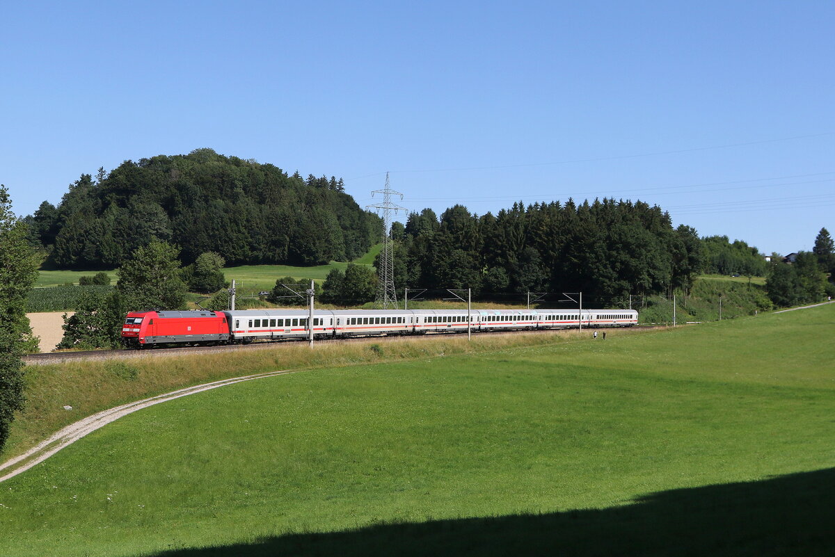 101 099-0 war mit dem "IC Königssee" am 7. August 2016 bei Übersee in Richtung Freilassing unterwegs.
