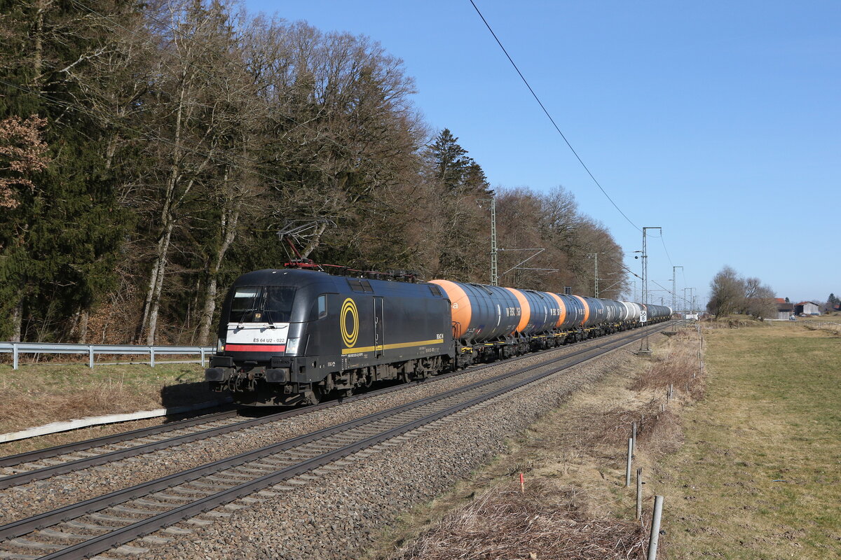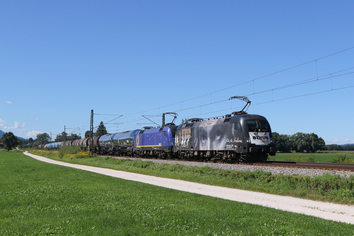 120 145 von "Widmer Rail Service" und 182 600 mit einem Kesselwagenzug aus Ingolstadt kommend am 24. Juni 2020 bei Dollnstein im Altmühltal.