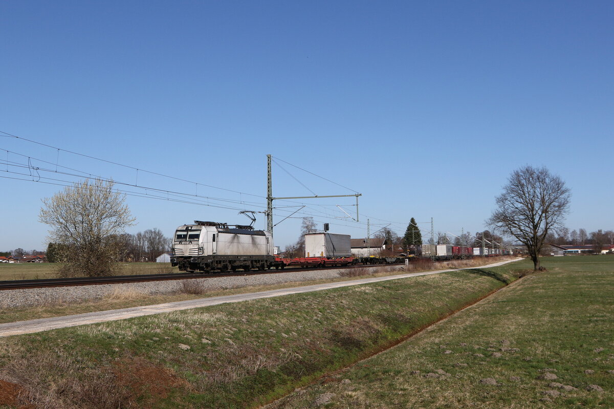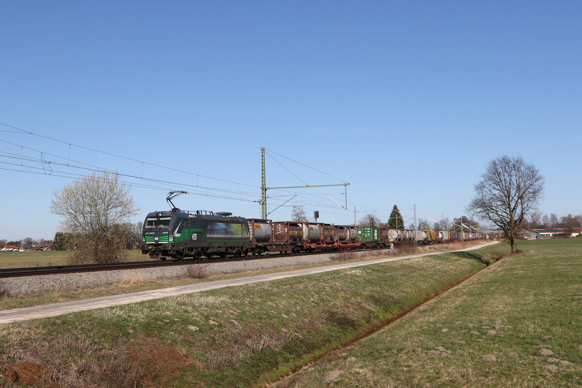 6193 143 von "Railpool" war mit einem gemischten Güterzug am 7. März 2026 bei Übersee am Chiemsee in Richtung München unterwegs.