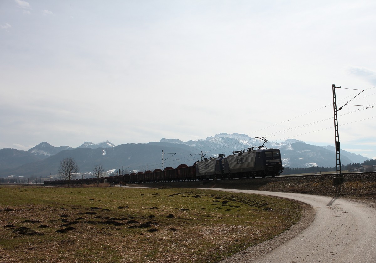 145 027 mit einem Containerzug am 6. August 2022 bei Himmelstadt am Main.