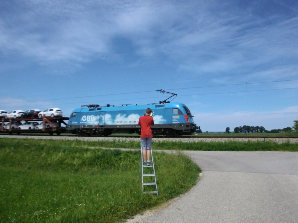 Geringe Körpergröße kann man ja ausgleichen. "ÖBB Grüne Schiene" unterwegs am 7. Juni 2012 Richtung Salzburg. (zum Bild)